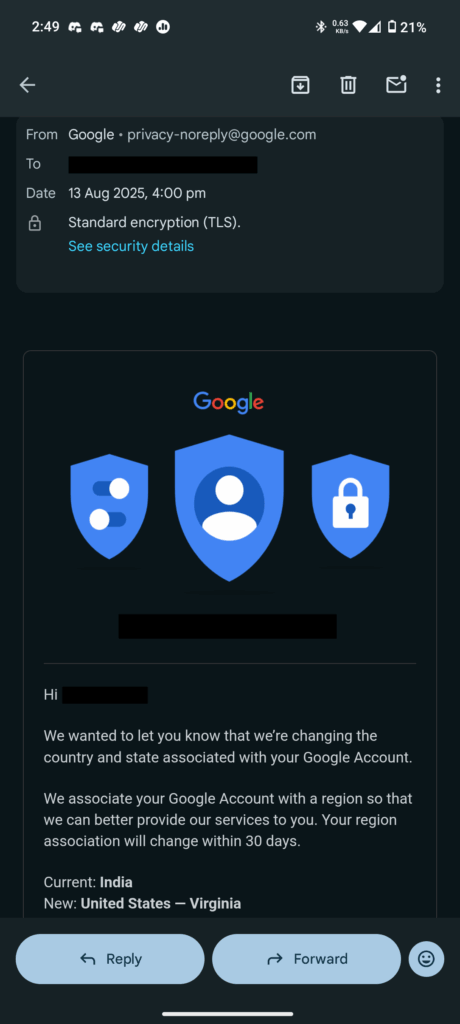 Last week, one of the contributors to Guilty Gamer reported to the team that Google had recently sent an email alerting them the company was going to change the country and state associated with their Google account, from India to Virginia in the US. That’s quite an odd change, if I don’t say so myself.