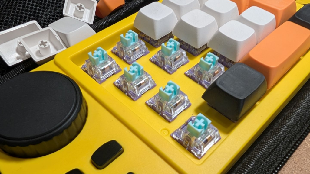 If you’re not a fan of the very loud injected plastic yellow case, the K811 is available in a black frame with orange and blue highlights or a white frame with red and blue highlights. It also comes fully assembled with its own hard case (though since I got it through AliExpress, your mileage may vary), USB-C to USB-A cable, two spare switches, and a key/switch removal tool.