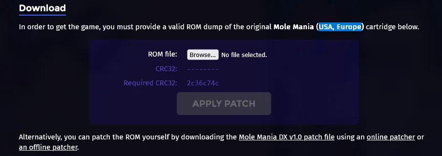 What’s particularly nice about the Mole Mania DX hack release is that it’s very easy to apply to a ROM of the game. First, you need to secure your ROM, which can be easily pulled from a physical cart using hardware like the GBxCart RW and the GB Operator, which I’ve covered in the past how they work if you’re curious. Once you have your ROM, simply navigate to the Mole Mania DX webpage. Keep in mind that you’ll need a copy of the USA or European ROM.